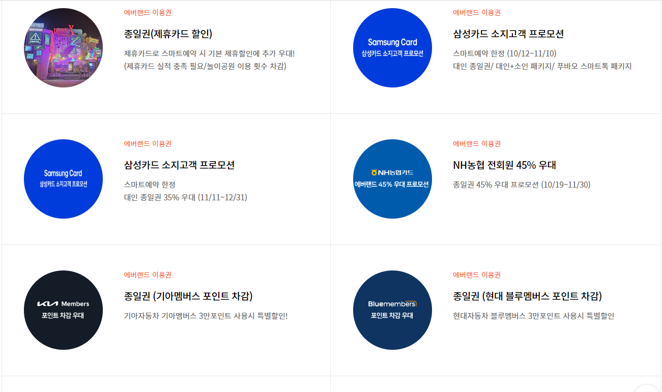 등 다양한 할인혜택이 있으니 위 [에버랜드 제휴할인 카드] 를 누르시고 해당 화면에서 살펴보세요.
