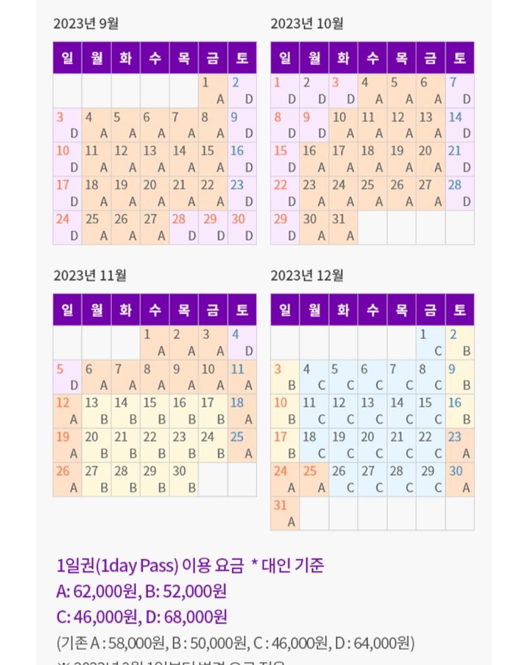 올해 들어 1년 정기권이 에버랜드 연간이용권에서 에버랜드 정기권으로 이름을 바꾸고, 시즌 캘린더도 새롭게 선보였는데요. 방문일을 A~D까지 4단계로 나눠서 일일이용권을 요금 책정을 했습니다.
