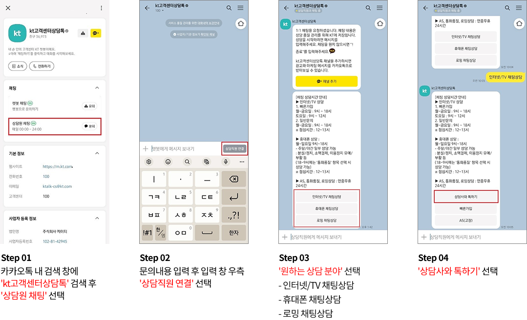 - 카카오톡 kt고객센터상담 검색 후 상담원 채팅 선택