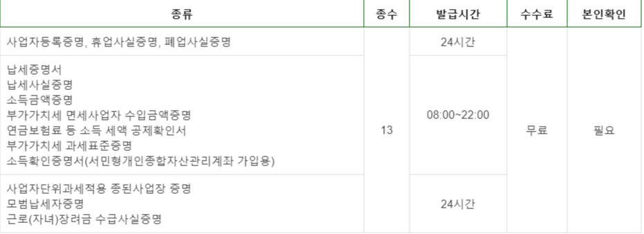 | 사업자등록증명, 휴업사실증명, 폐업사실증명 | 13 | 24시간 | 무료 | 필요 |