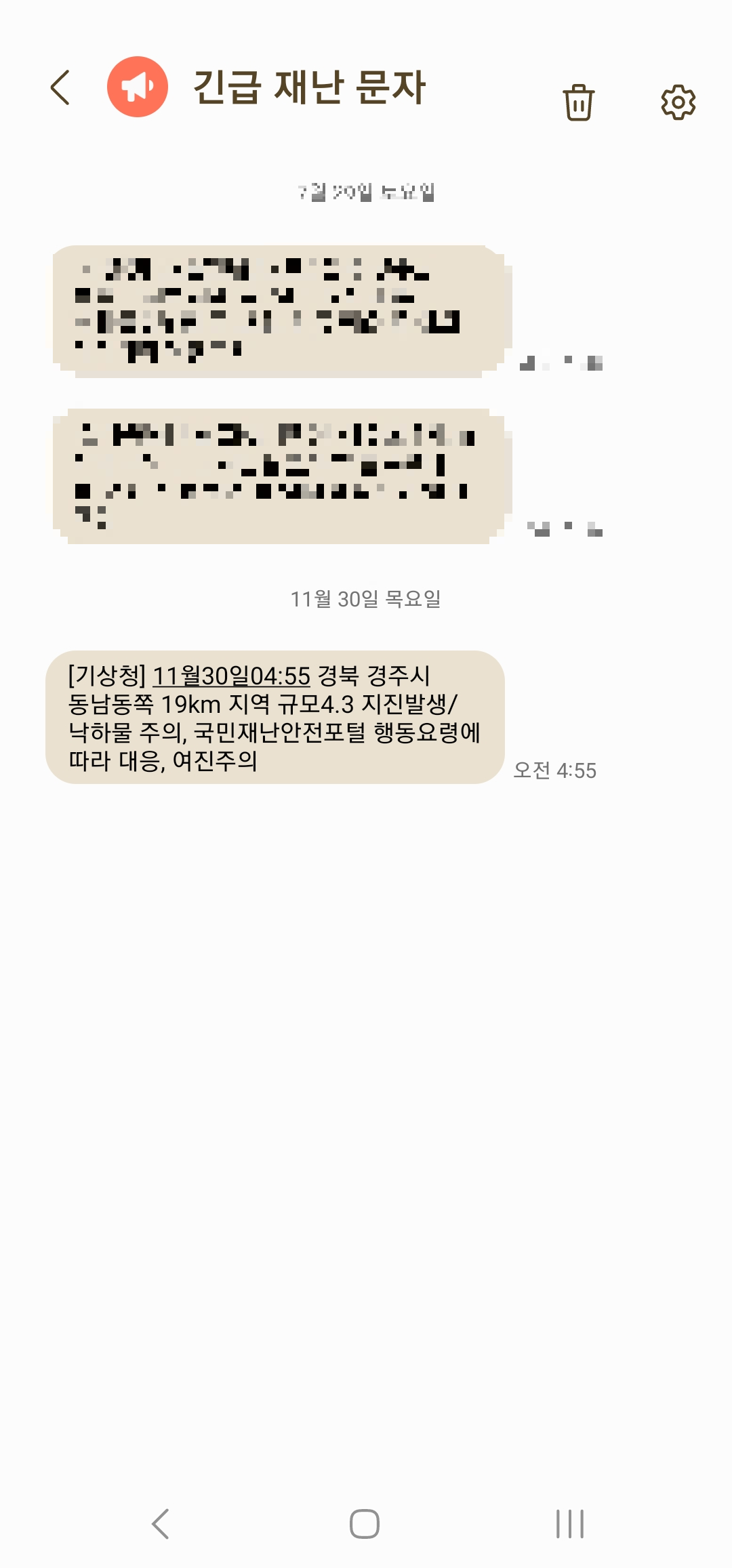 11월 30일 새벽 4시 55분 지진 발생 경북 경주시 동남동쪽 19km 4.3 규모 지진 긴급재난 문자