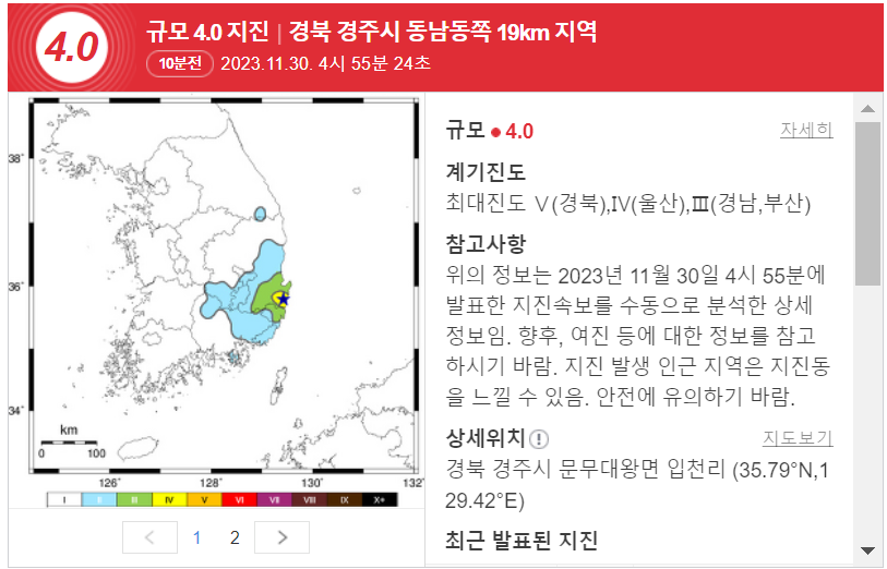 30일 오전 4시55분25초쯤 경북 경주시 동남동쪽 19㎞ 지역(북위 35.79, 동경 129.42)에서 추정 규모 4.3의 지진이 발생했 습니다. 진앙은 북위 35.81도, 동경 127.53도입니다.