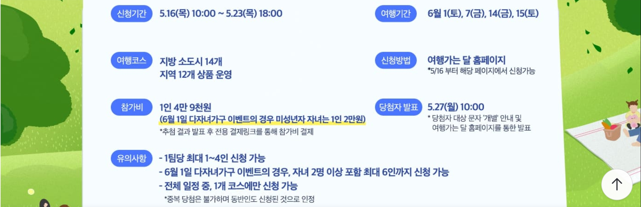 - 개인 정보 및 지원: 1인당 1회만 지원 가능하며, 여행 당일 신분증 확인이 필요합니다.