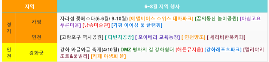 | 경기 | 가평 | 자라섬 꽃페스타(5-6월/ 9-10월) [에델바이스 스위스 테마파크] [꿈의동산 놀이공원] [아침고요푸른마을] [남송미술관] [가평 아이섬 풀 글램핑] |