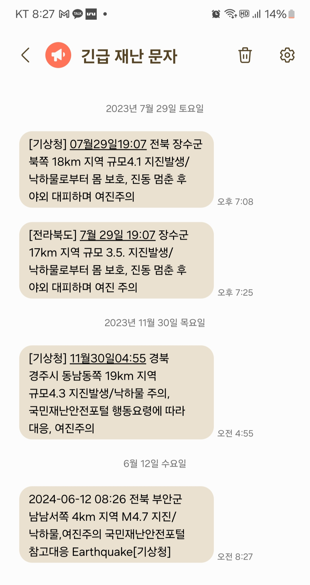2023년 11월 30일 새벽 4시 55분에도 경북 지진으로 긴급재난 문자도 받았고요.