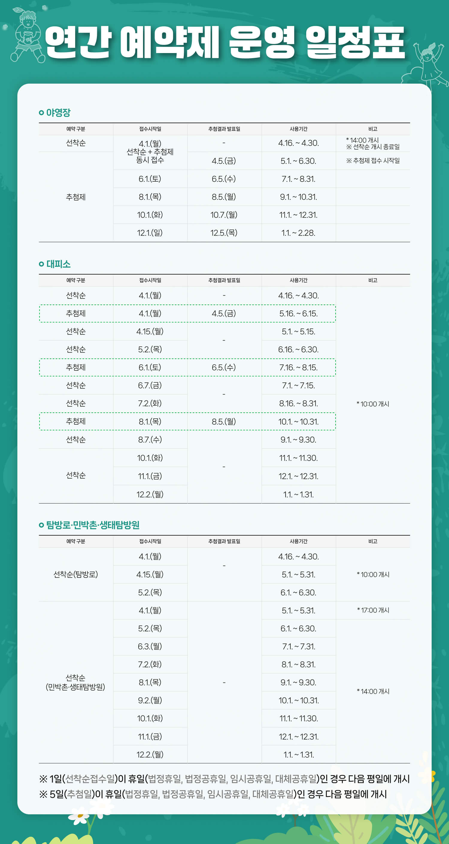 야영장 2024년 9월~10월 예약은 8월 1일부터 시작됩니다. 대피소와 생태탐방원, 민박촌, 탐방로는 각각 다르니 아래 사진을 확인하세요.