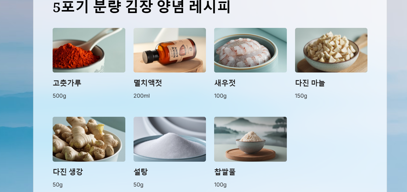 | 고춧가루와 재료의 비율 | 고춧가루 500g, 멸치액젓 150ml, 새우젓 100g, 마늘 100g, 생강 40g, 설탕 50g, 파 200g, 무 200g, 양파 100g | 비율에 맞추어 재료를 계량하고 준비 |