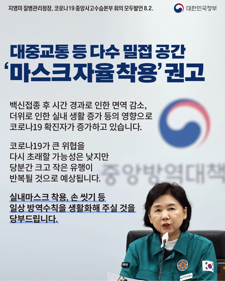 중앙방역대책본부는 “이 추세대로라면 이달 중순 확진자 규모는 일평균 약 6만명, 하루 최대 7만6000명 정도에 이를 것”이라고 발표하며, 지난 2일 대중교통이나 다중이용시설 등 다수가 모이는 공간에서 마스크를 다시 자율적으로 착용할 것을 권고했습니다.