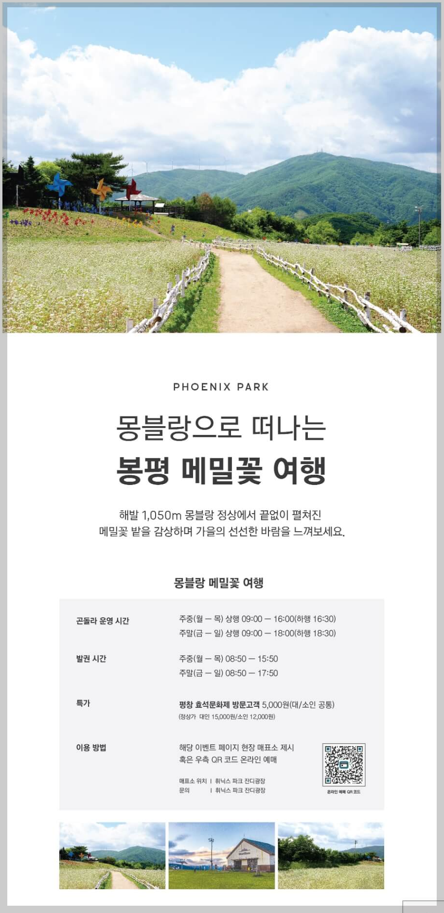 - 몽블랑은 스키 슬로프 정상(1050m)에 자리한 하늘 정원으로, 정상에 너른 메밀꽃밭이 펼쳐져 있습니다.
