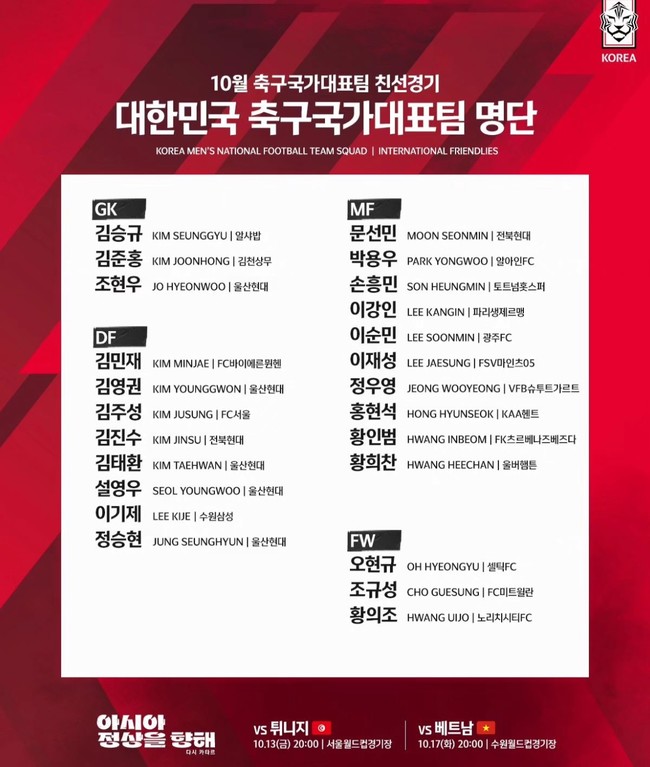10월 13일 한국에서 치르는 A메치 친선경기 선수명단에 김민재 선수가 포함되었는데요.